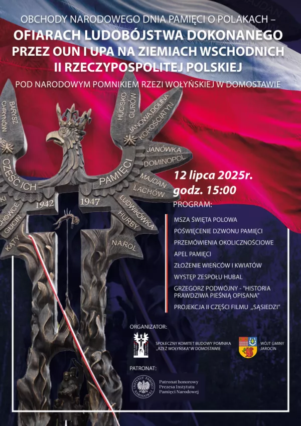 W sobotę, 12 lipca 2025 r. o godz. 15:00, pod Narodowym Pomnikiem Rzezi Wołyńskiej w Domostawie (gmina Jarocin) odbędą się centralne uroczystości regionalne!