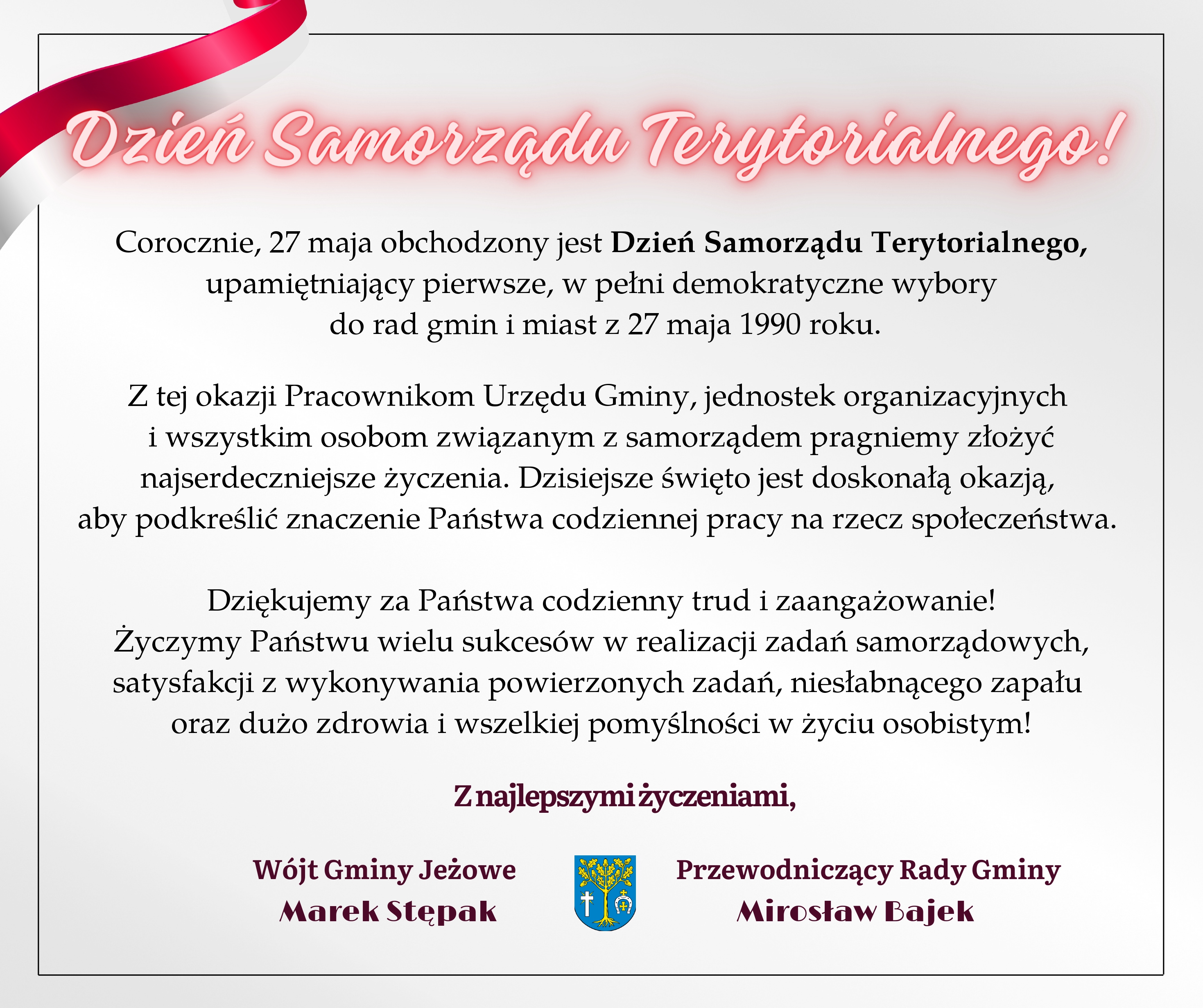 Z tej okazji Pracownikom Urzędu Gminy Jeżowe, jednostek organizacyjnych i wszystkim osobom związanym z samorządem pragniemy złożyć najserdeczniejsze życzenia!