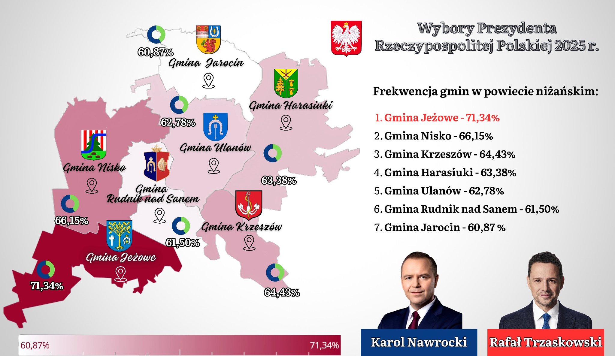 W wyborach Prezydenta Rzeczypospolitej Polskiej 2025 r. frekwencja w naszej Gminie wyniosła 𝟕𝟏,𝟑𝟒%, najwyżej w powiecie niżańskim (średnia w powiecie — 65,00%).