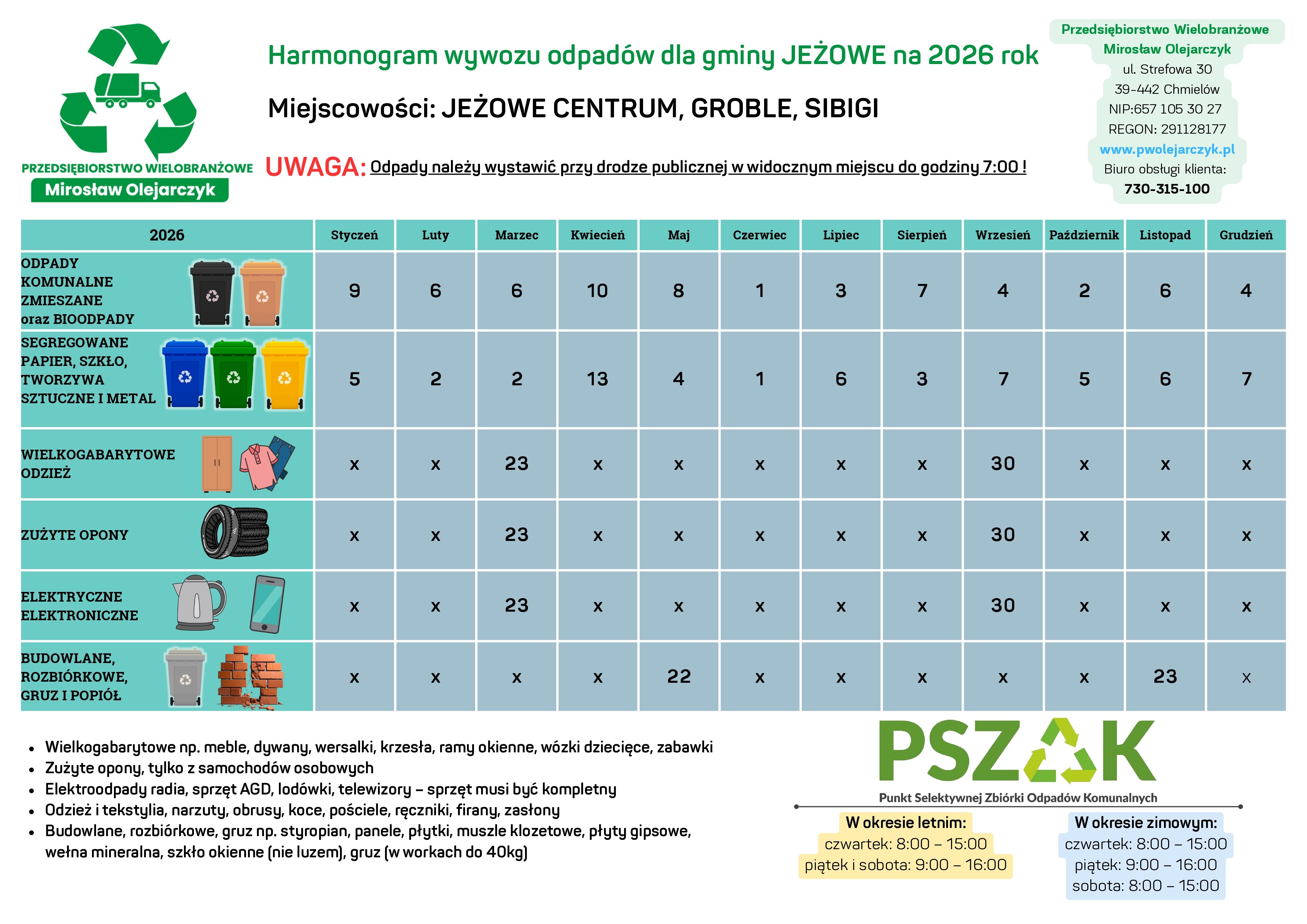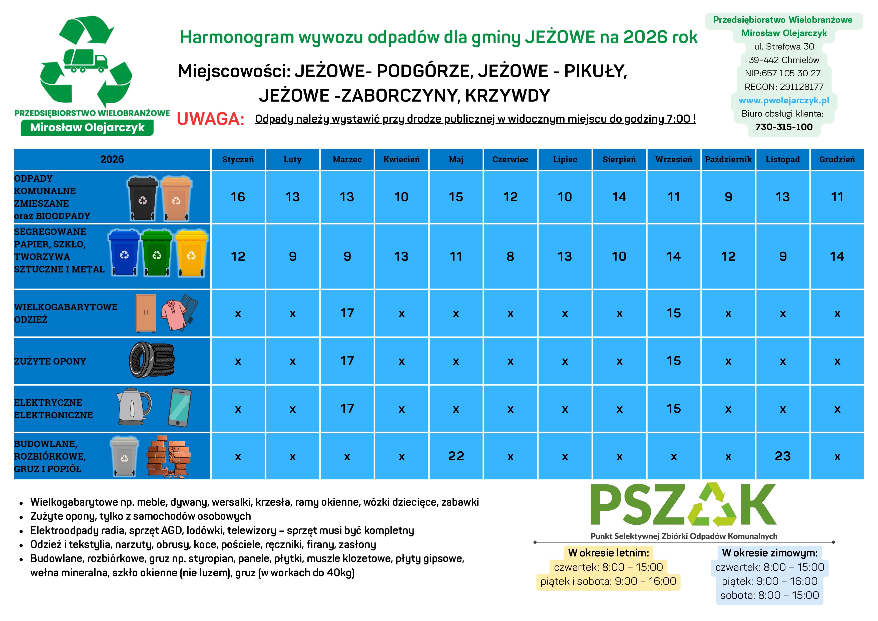 Harmonogram wywozu odpadów na rok 2026