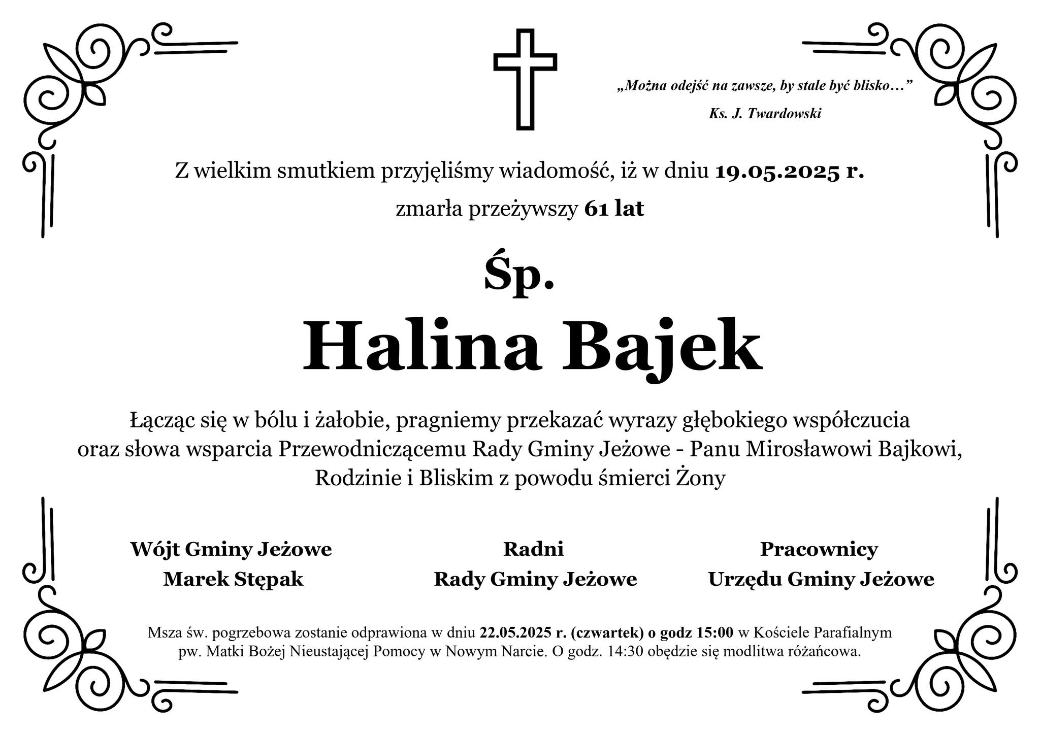 Msza św. pogrzebowa zostanie odprawiona w dniu 22.05.2025 r. (czwartek) o godz 15:00 w Kościele Parafialnym pw. Matki Bożej Nieustającej Pomocy w Nowym Narcie.