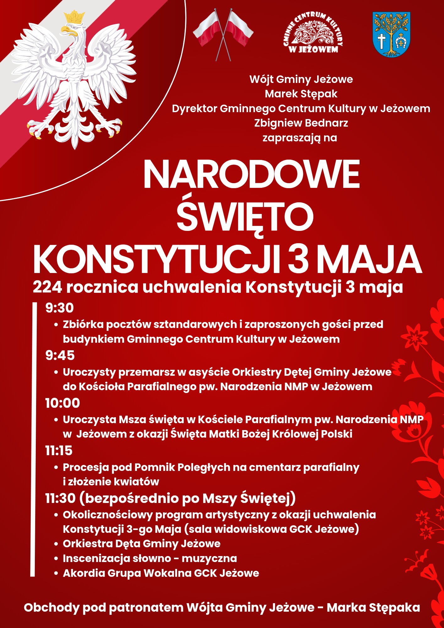Z okazji 234 rocznicy. uchwalenia Konstytucji 3 maja Wójt Gminy Jeżowe Marek Stępak oraz Dyrektor Gminnego Centrum Kultury w Jeżowem Zbigniew Bednarz zapraszają do wspólnego uczczenia tej wyjątkowej rocznicy podczas gminnych uroczystości upamiętniających to przełomowe wydarzenie w historii Polski!