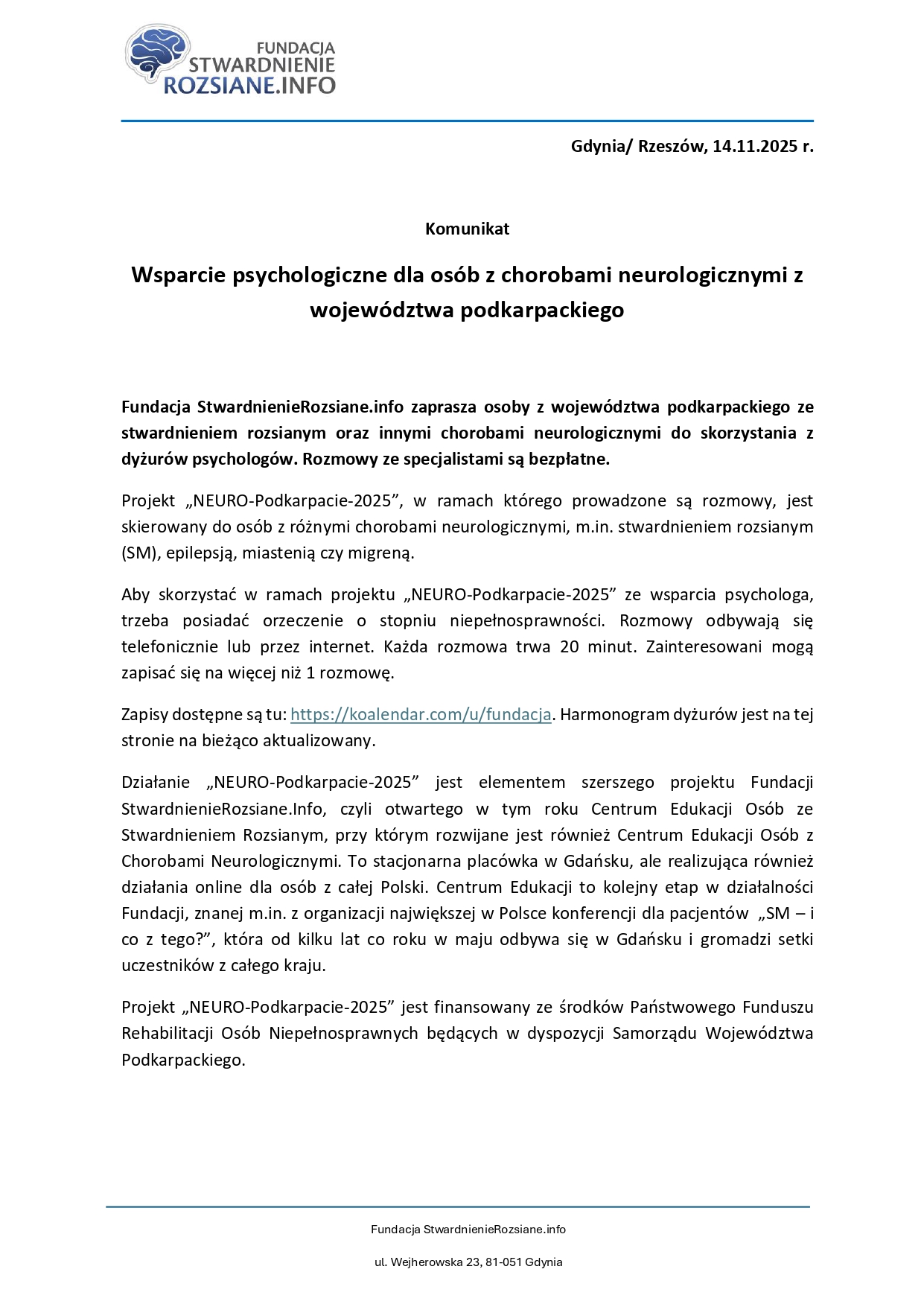 Wsparcie psychologiczne dla osób z chorobami neurologicznymi z województwa podkarpackiego