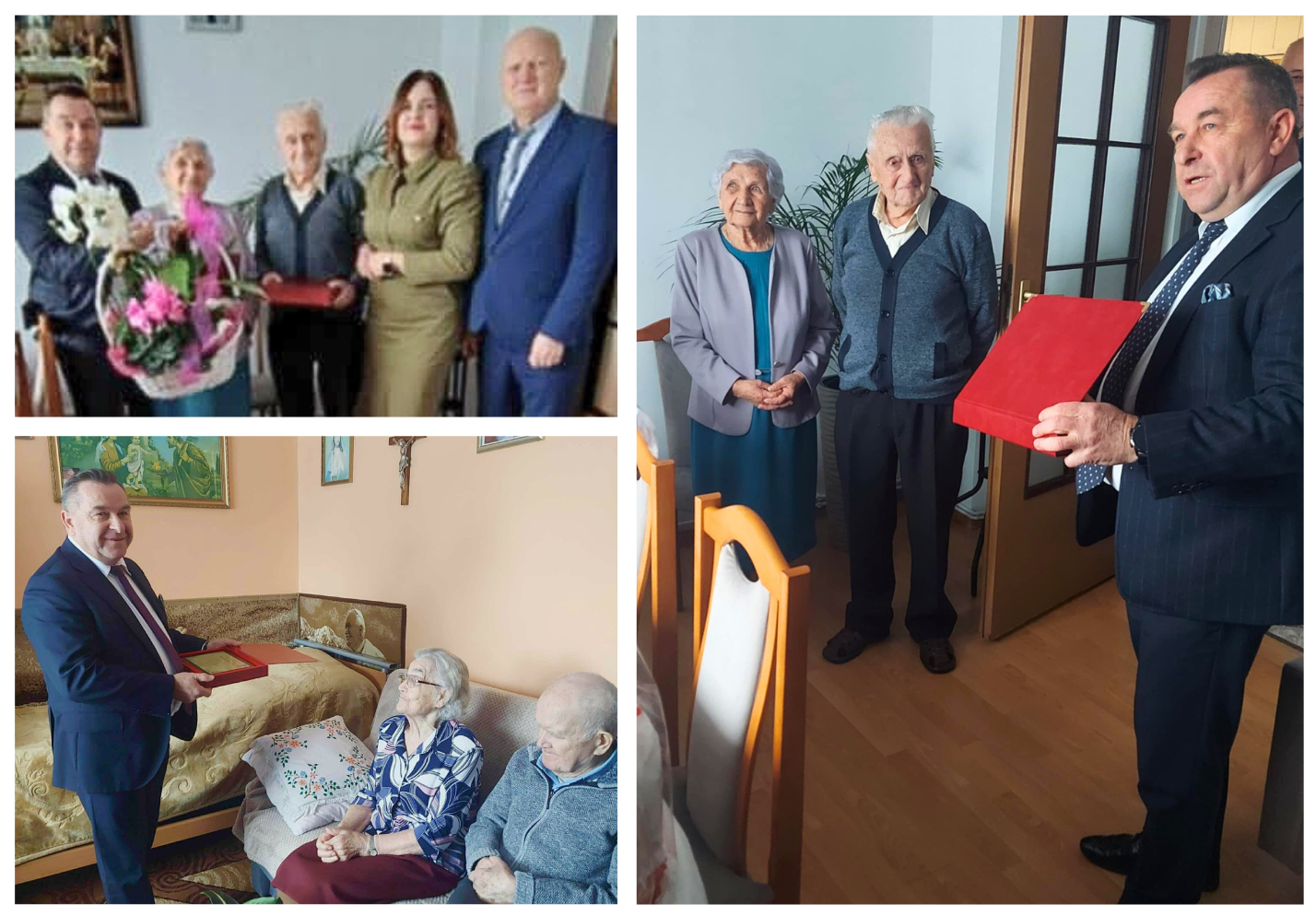 Z okazji obu jubileuszy Wójt Gminy Jeżowe Marek Stępak, Kierownik Ośrodka Pomocy Społecznej Małgorzata Bolka oraz Kierownik Urzędu Stanu Cywilnego Marek Błądek, odwiedzili Jubilatów, składając im serdeczne gratulacje i wyrazy uznania w imieniu całej społeczności oraz władz samorządowych Gminy Jeżowe. Spotkania były okazją do wspólnego wspominania wspólnie spędzonych lat oraz do wyrażenia uznania dla trwałości i siły małżeńskich więzi. Jubilaci z wielką wdzięcznością przyjęli okazaną pamięć i serdeczne życzenia, a rozmowy toczyły się w atmosferze wzruszenia, radości i wzajemnego szacunku. Całe spotkanie, w obecności członków rodziny, stało się pięknym wspólnym świętowaniem oraz niezapomnianym świadectwem życia wypełnionego miłością i wspólnymi doświadczeniami.
