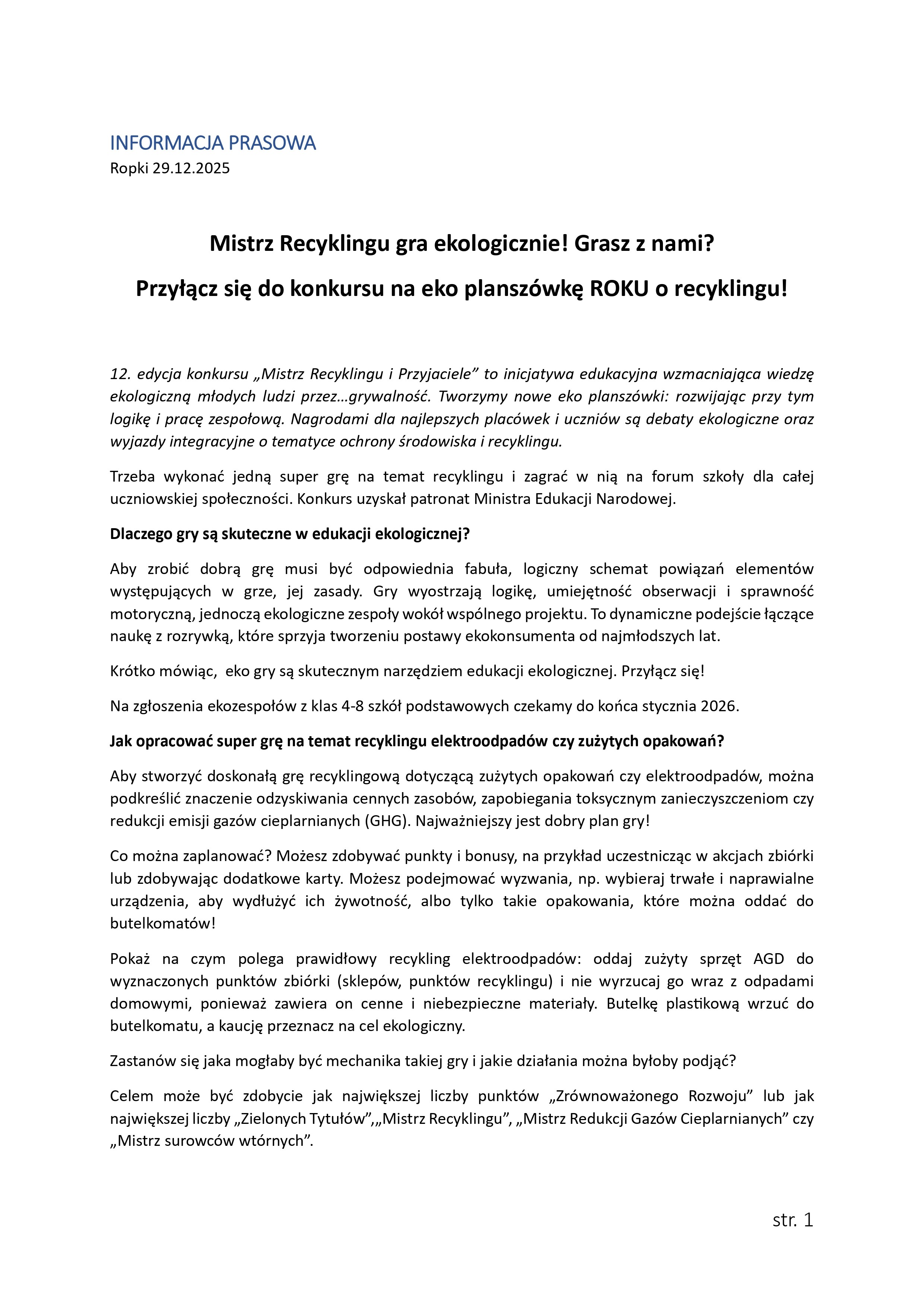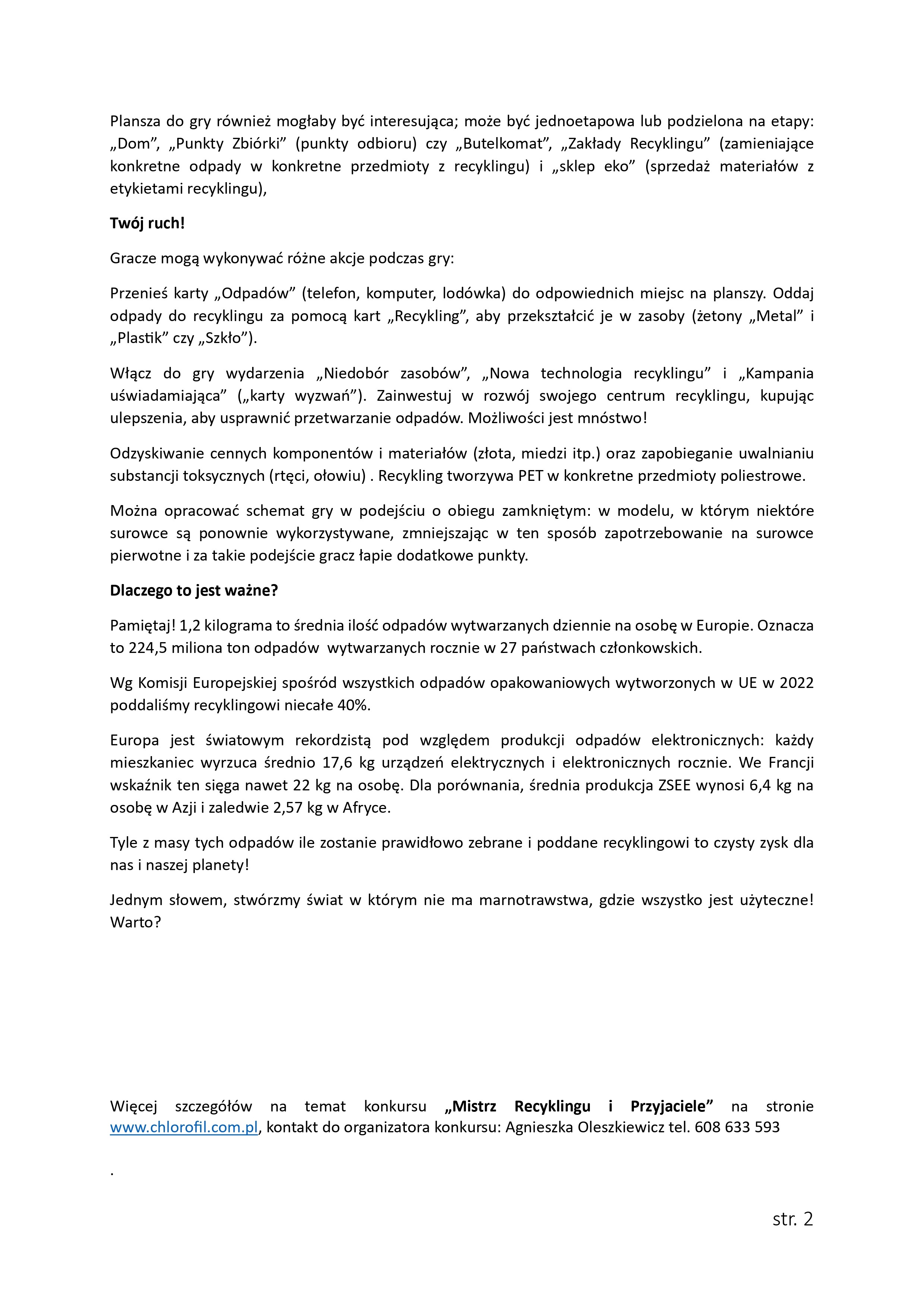 Zadanie konkursowe: opracujcie własną grę planszową o recyklingu (np. elektroodpadów, opakowań) i zagrajcie w nią na forum szkoły – dla całej społeczności uczniowskiej.