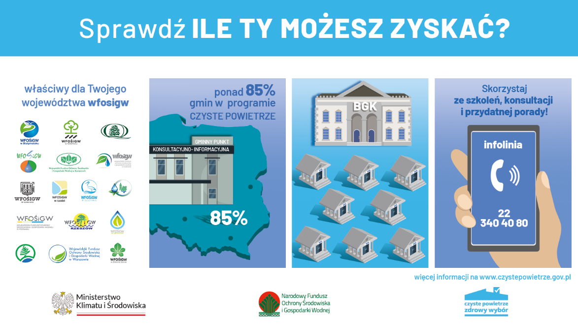 O Program możesz dopytać w naszym Urzędzie Gminy, w punkcie konsultacyjno – informacyjnym. Tutaj otrzymasz wsparcie w przygotowaniu i złożeniu wniosku do programu Czyste Powietrze.