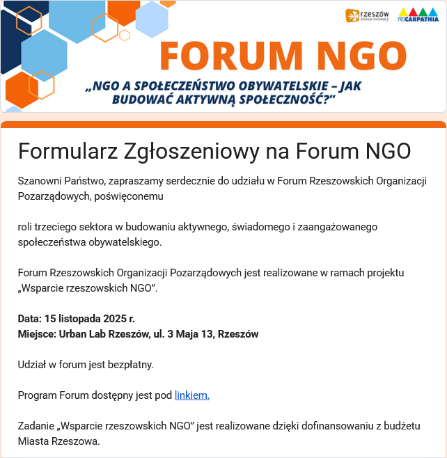 Wydarzenie będzie okazją do wymiany doświadczeń, poznania dobrych praktyk, inspirujących rozmów oraz wspólnego poszukiwania sposobów na wzmacnianie roli organizacji pozarządowych w życiu lokalnych społeczności. Udział w forum jest bezpłatny. Program Forum dostępny jest pod linkiem.