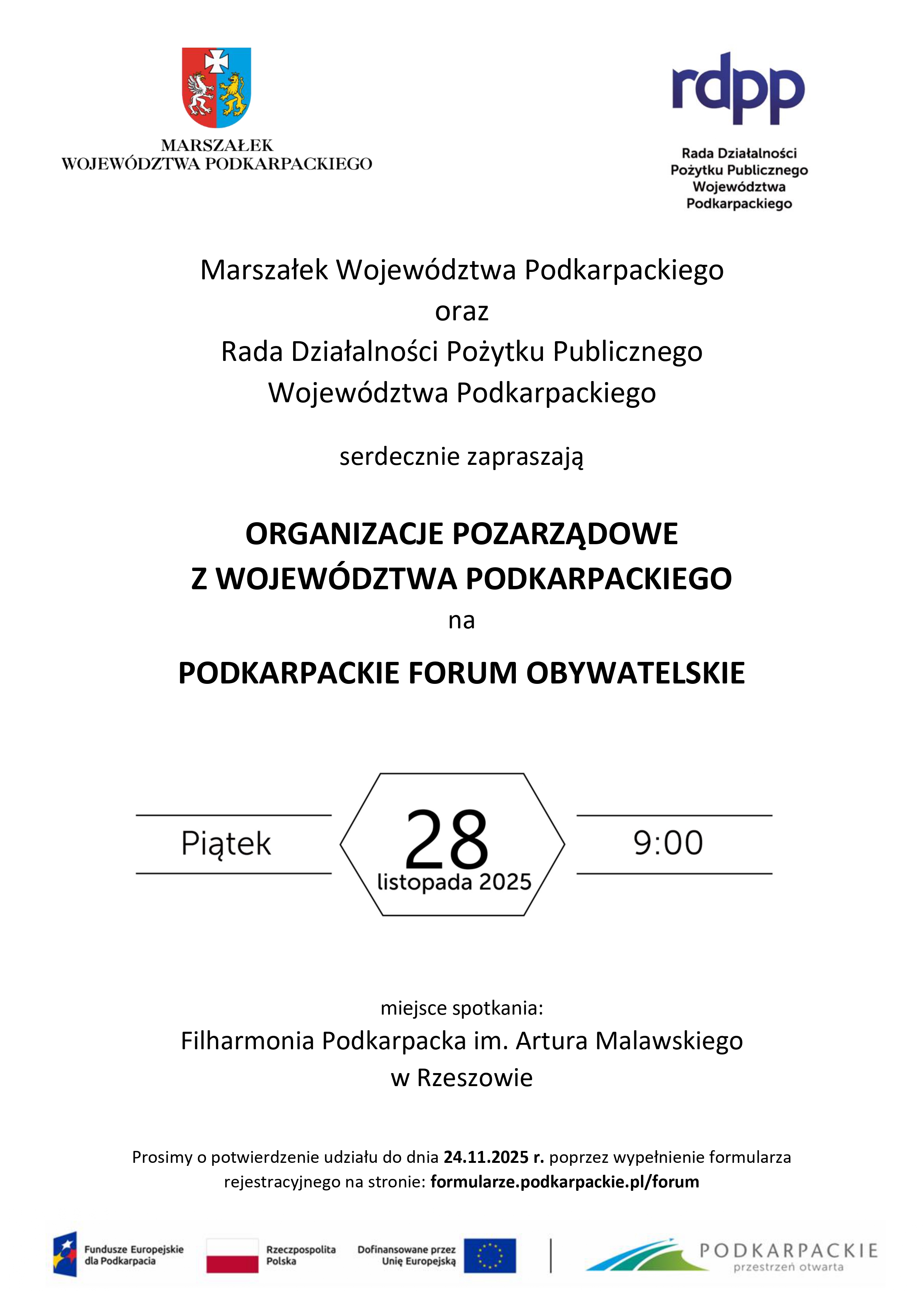 Zaproszenie dla organizacji pozarządowych działających na terenie gminy Jeżowe na Podkarpackie Forum Obywatelskie, które odbędzie się 28 listopada 2025 r. o godz. 9:00 w Filharmonii Podkarpackiej w Rzeszowie: