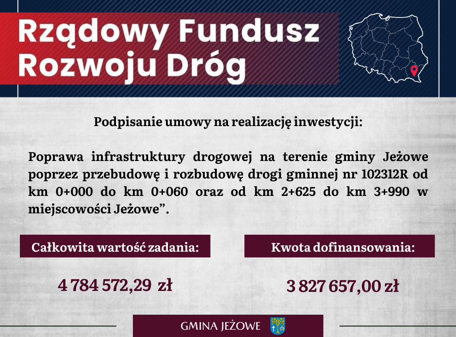Na realizację tej inwestycji Wójt Gminy Jeżowe pozyskał dofinansowanie z Rządowego Funduszu Rozwoju Dróg, w wysokości 3 827 657,00 zł stanowiące 80% wartości inwestycji. Całkowita wartość zadania wynosi 4 784 572,29 złotych.