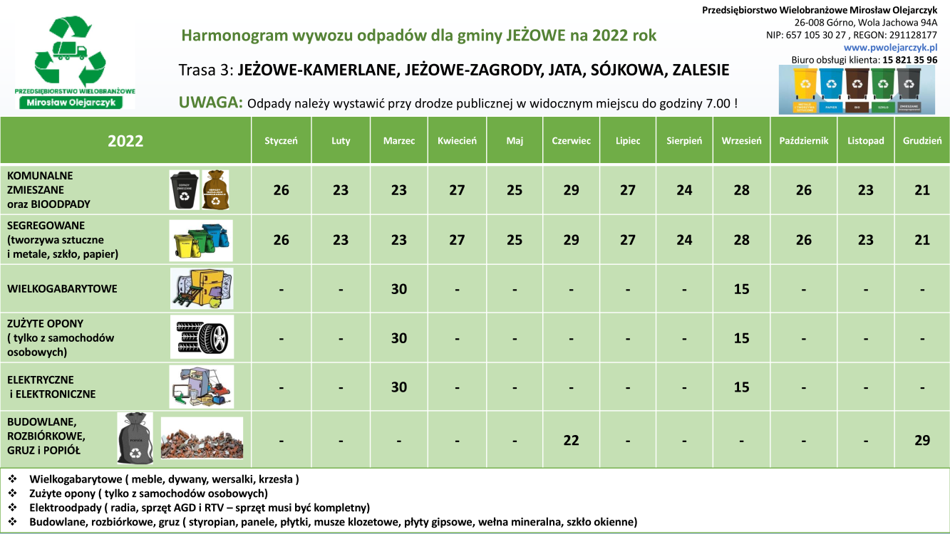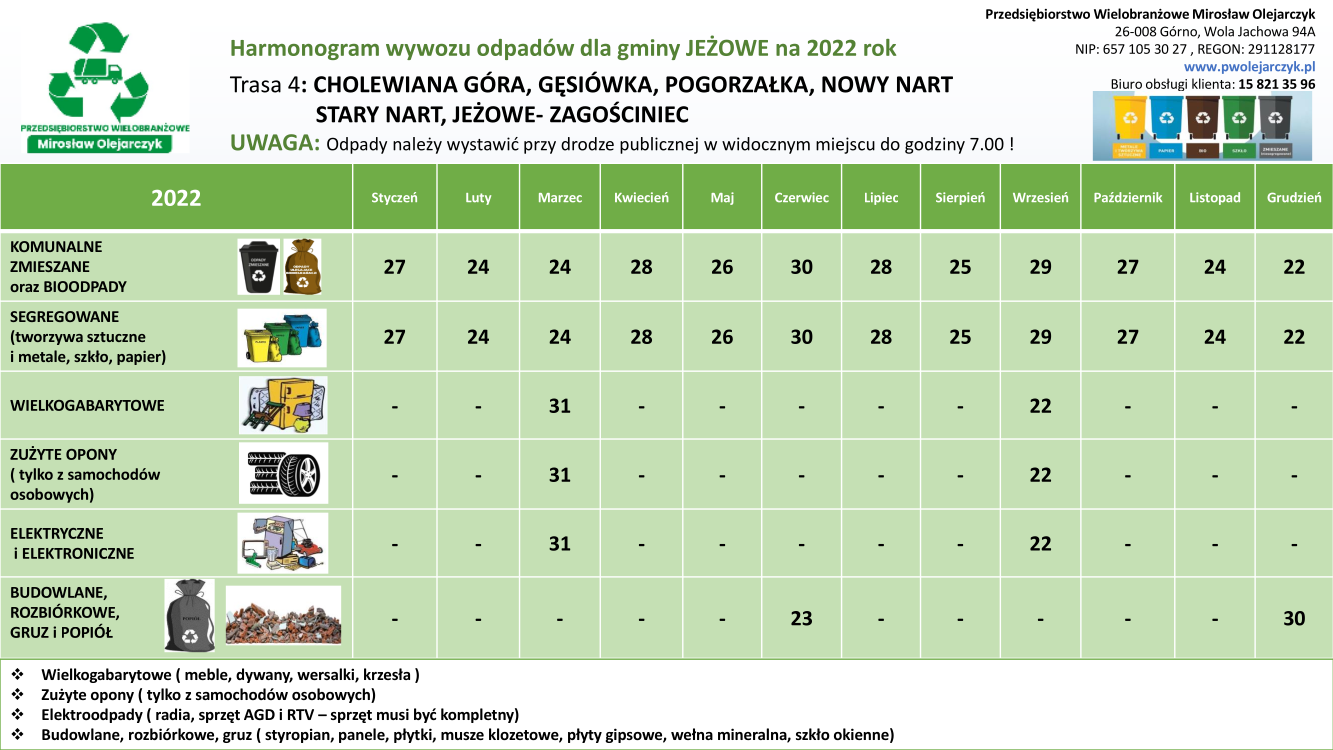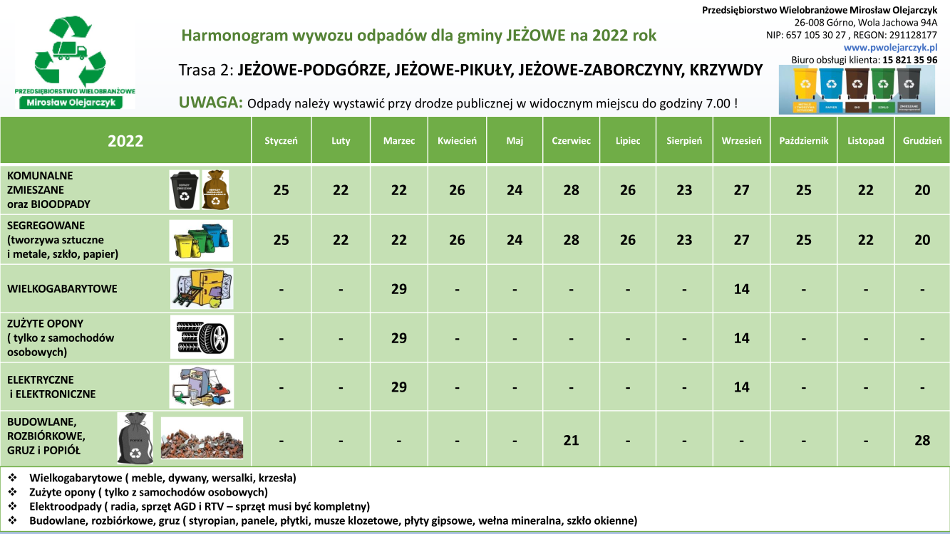 Harmonogram wywozu odpadów dla gminy Jeżowe na 2022 rok