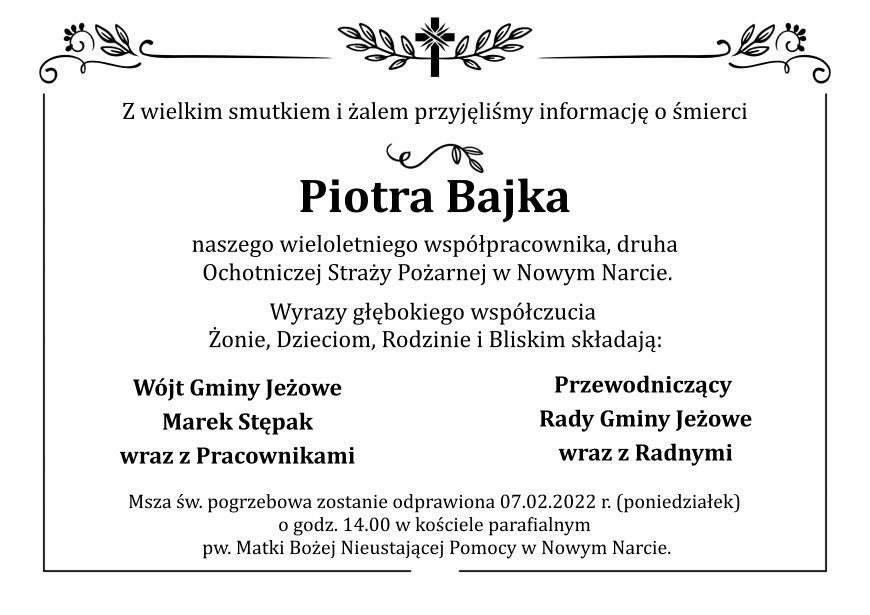 Msza św. pogrzebowa zostanie odprawiona 07.02.2022 r. (poniedziałek) o godz. 14.00 w kościele parafialnym pw. Matki Bożej Nieustającej Pomocy w Nowym Narcie.