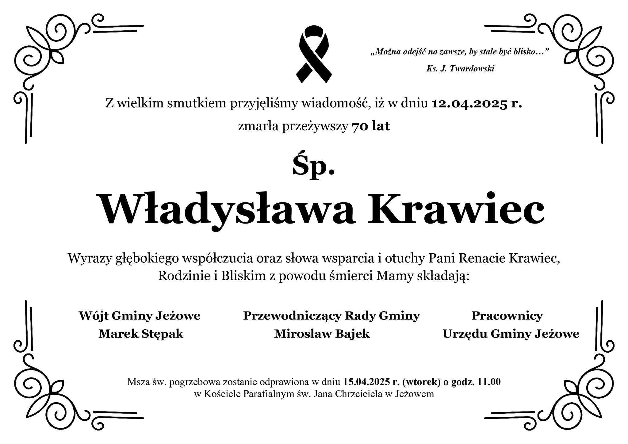 Msza św. pogrzebowa zostanie odprawiona w dniu 15.04.2025 r. (wtorek) o godz. 11.00 w Kościele Parafialnym św. Jana Chrzciciela w Jeżowem.